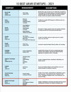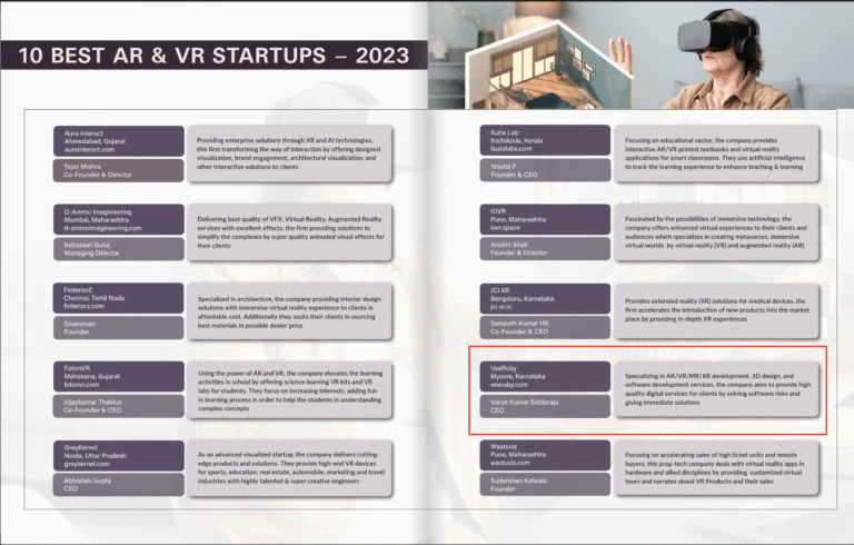 Featured by Silicon India as one of the “10 Best AR/VR Startups 2021”, recognising VeeRuby Technologies for immersive-technology innovation and market readiness in India’s XR ecosystem.